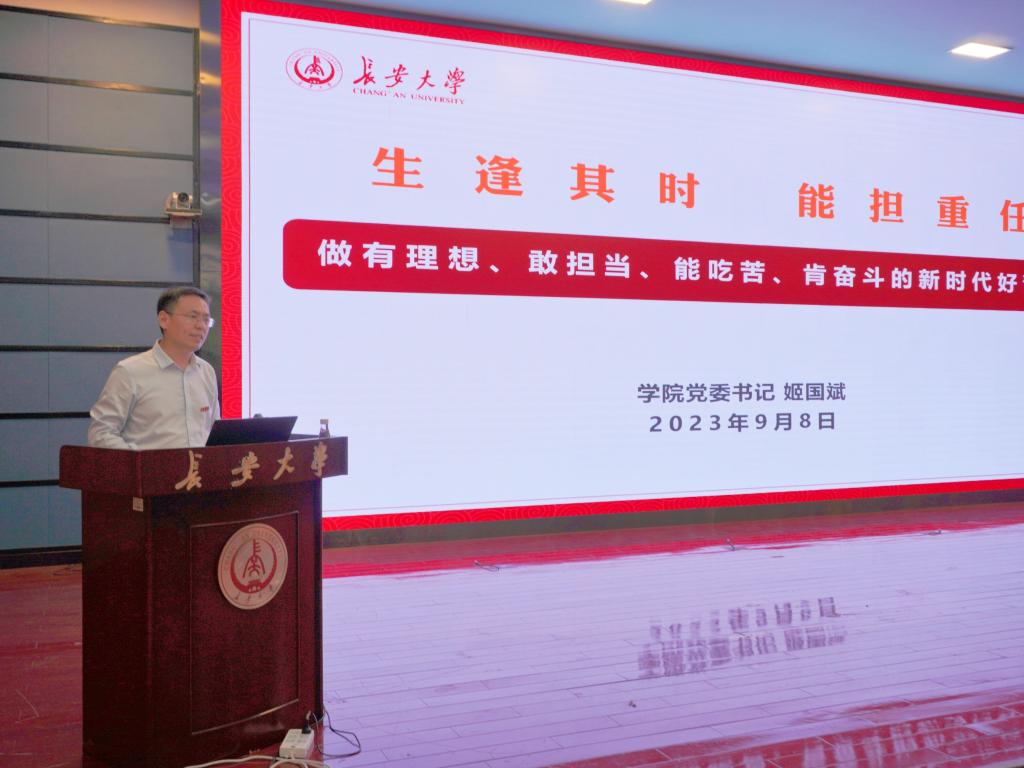 典礼结束后,姬国斌以“生逢其时 能担重任,做有理想、敢担当、能吃苦、肯奋斗的新时代好青年”为新生讲授开学第一课。他围绕“我们的时代”“我们的大学”“我们的责任”三个方面,指出新时代是快速发展、需要人才、大有可为的时代,青年学生拥有建功立业的广阔平台。他介绍了学校的发展历程成就,讲解杰出校友爱国奉献、创新奋斗的先进事迹,深刻解读新时代大学生的责任使命。他对全体新生寄予殷切希望,希望他们做有理想信念追求、有担当作为闯劲、有吃苦耐劳精神、做有团结奋斗品质的大学生,在长安大学学有所成、研有所进,挺膺担当、矢志奋斗,做堪当民族复兴重任的时代新人。