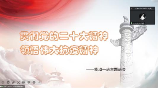 班会第一部分由孙梦园同学主持,主题为“学习贯彻党的二十大精神,领悟伟大抗疫精神”。