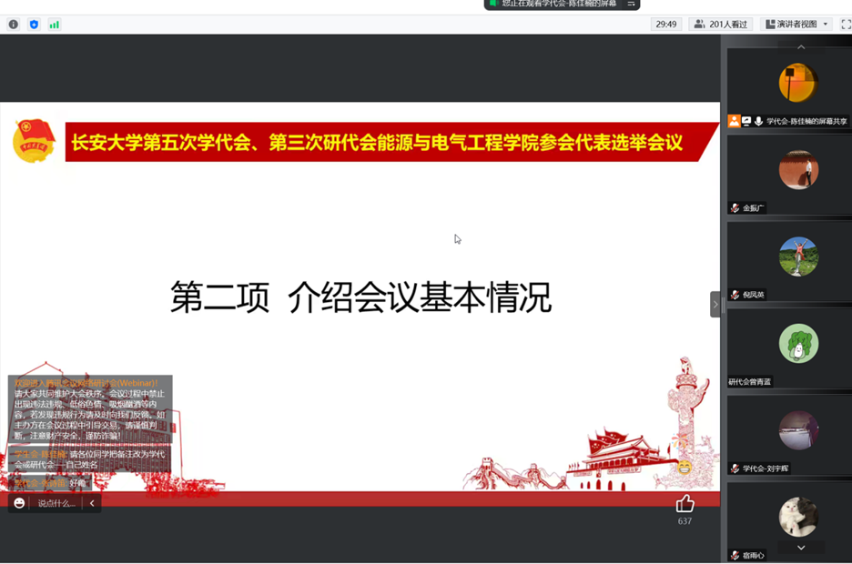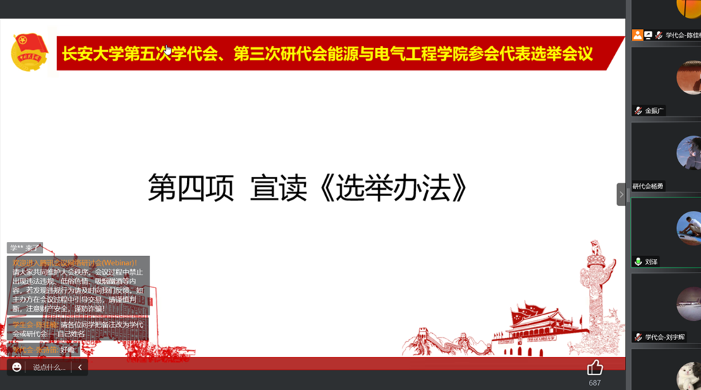 12月2日晚,bat365在线中国官网登录入口通过线上方式举办长安大学第五次学生代表大会、第三次研究生代表大会参会代表选举会议。院党委副书记倪凤英,院团委书记金振广,学生会指导老师刘泽,研究生会指导老师宿雨心出席本次会议,参加会议还有本科生代表和研究生代表。会议由我院学生会执行主席陈佳楠主持。