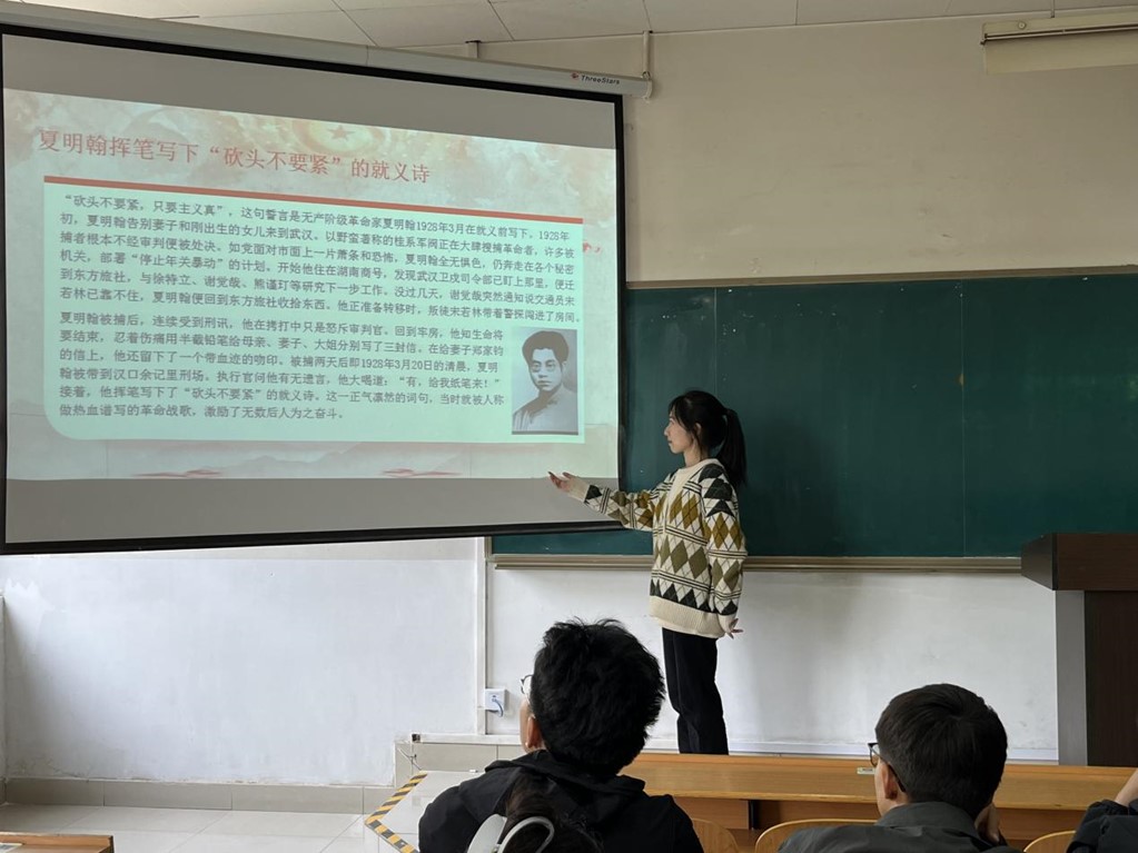 会议第四项内容,由陈易君分享夏明翰挥笔写下“砍头不要紧”的就义诗的事迹。夏明翰毫无惧色、不怕牺牲的革命精神,对共产主义信念的坚定不移,都给我们提供了许多有益的启示。