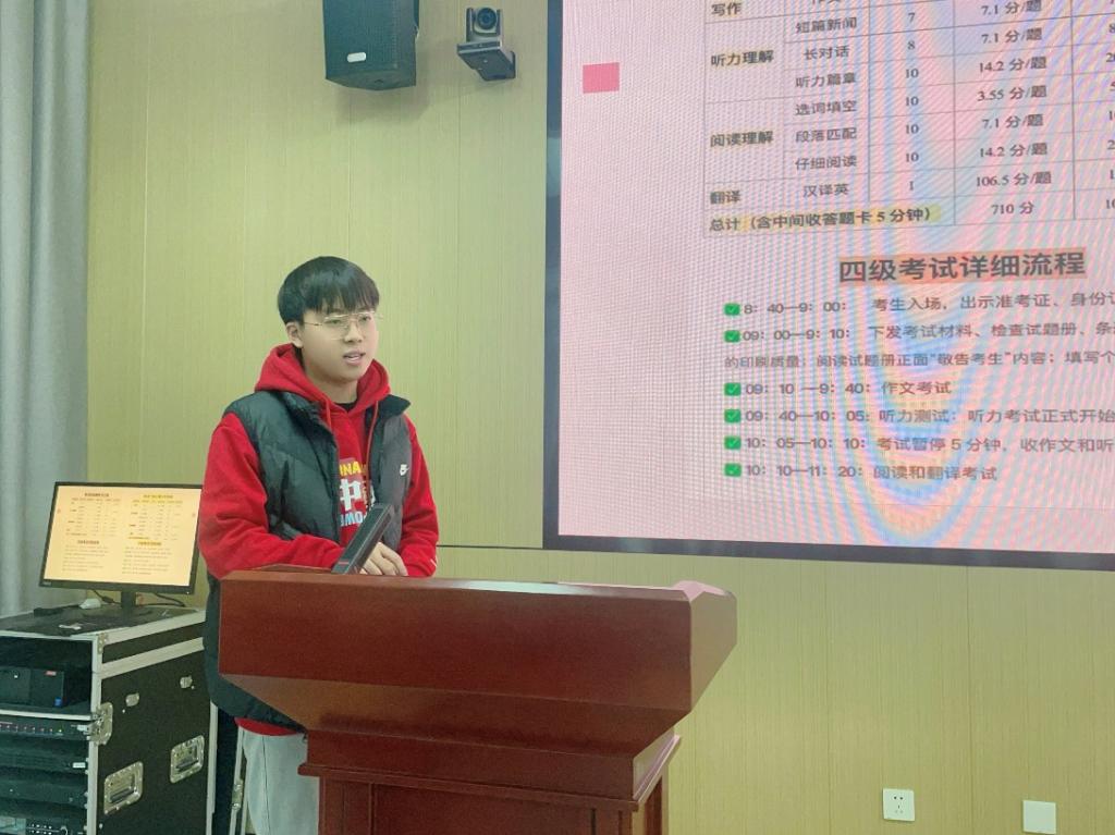 詹栩轩学长则侧重于考试流程、考试准备以及题型分值的介绍。他首先向同学们清晰地讲解了四六级考试的整个流程,从进入考场前的准备,到考试过程中的各个环节,再到考试结束后的注意事项,让同学们对考试有了一个全面的了解。在考试准备方面,詹栩轩学长建议同学们提前准备好考试所需的文具和证件,并且要提前调整好自己的作息时间,以最佳的状态迎接考试。对于题型分值,他详细地列出了每一部分的分值占比,并根据分值建议同学们合理分配复习时间和答题时间,优先确保高分值部分的答题质量。